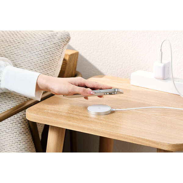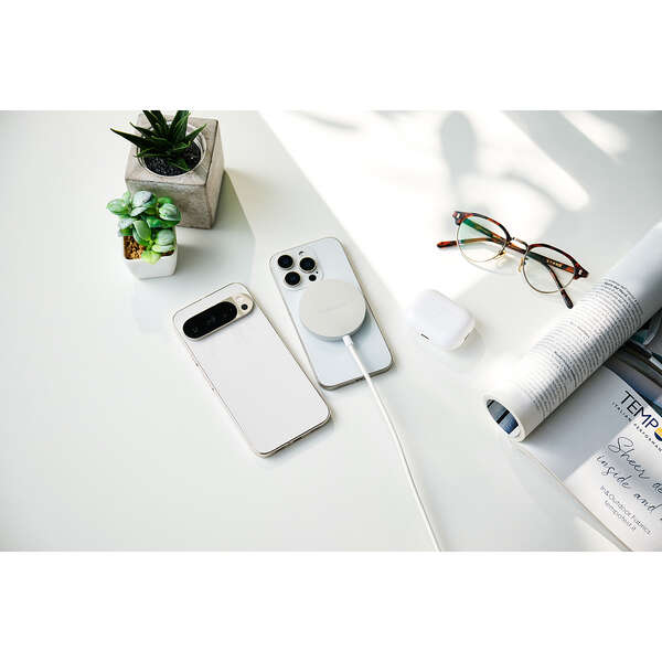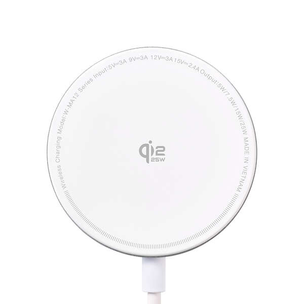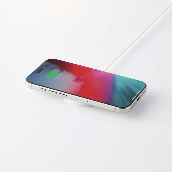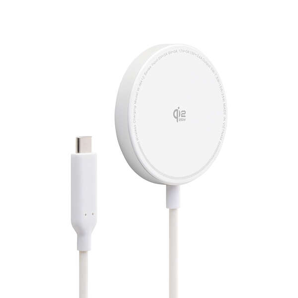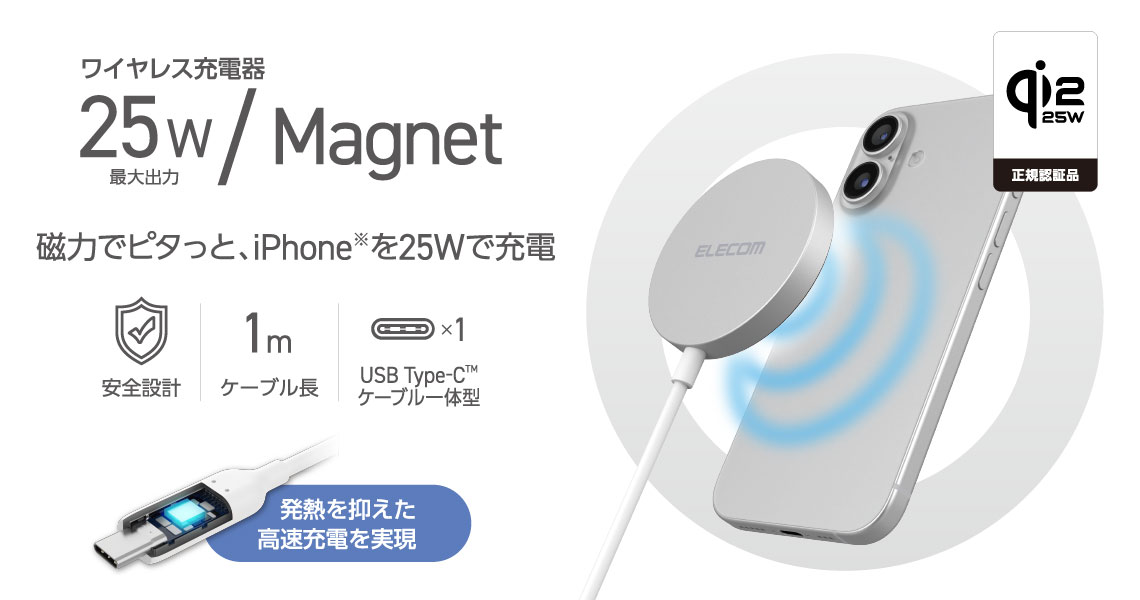 マグネットで対応するスマートフォンに固定するだけで高速充電できる、Qi2 25W規格対応のワイヤレス充電器です。