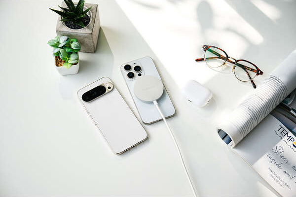 最大25W出力で、ワイヤレス充電がもっと速くなる。Qi2 25W対応のスマートフォンを高速充電できる、マグネット式ワイヤレス充電器です。基板をコネクター側に分散することで、発熱を抑える設計。スマートフォンの背面にぴったりくっつき、操作しながらの充電も快適です。