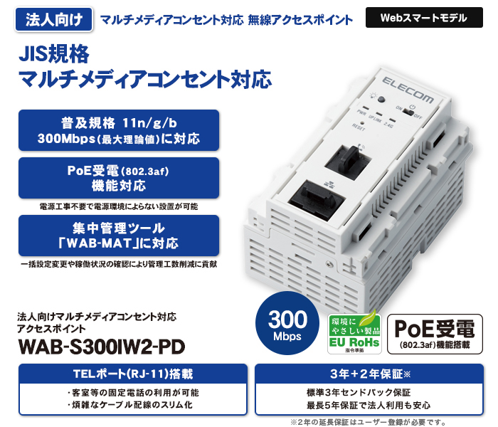 JIS規格マルチメディアコンセントに設置可能! 普及規格の2.4GHz 11n/g/bに対応し、最大300Mbpsの通信が可能な、法人向けマルチメディアコンセント対応PoE/11n無線AP。