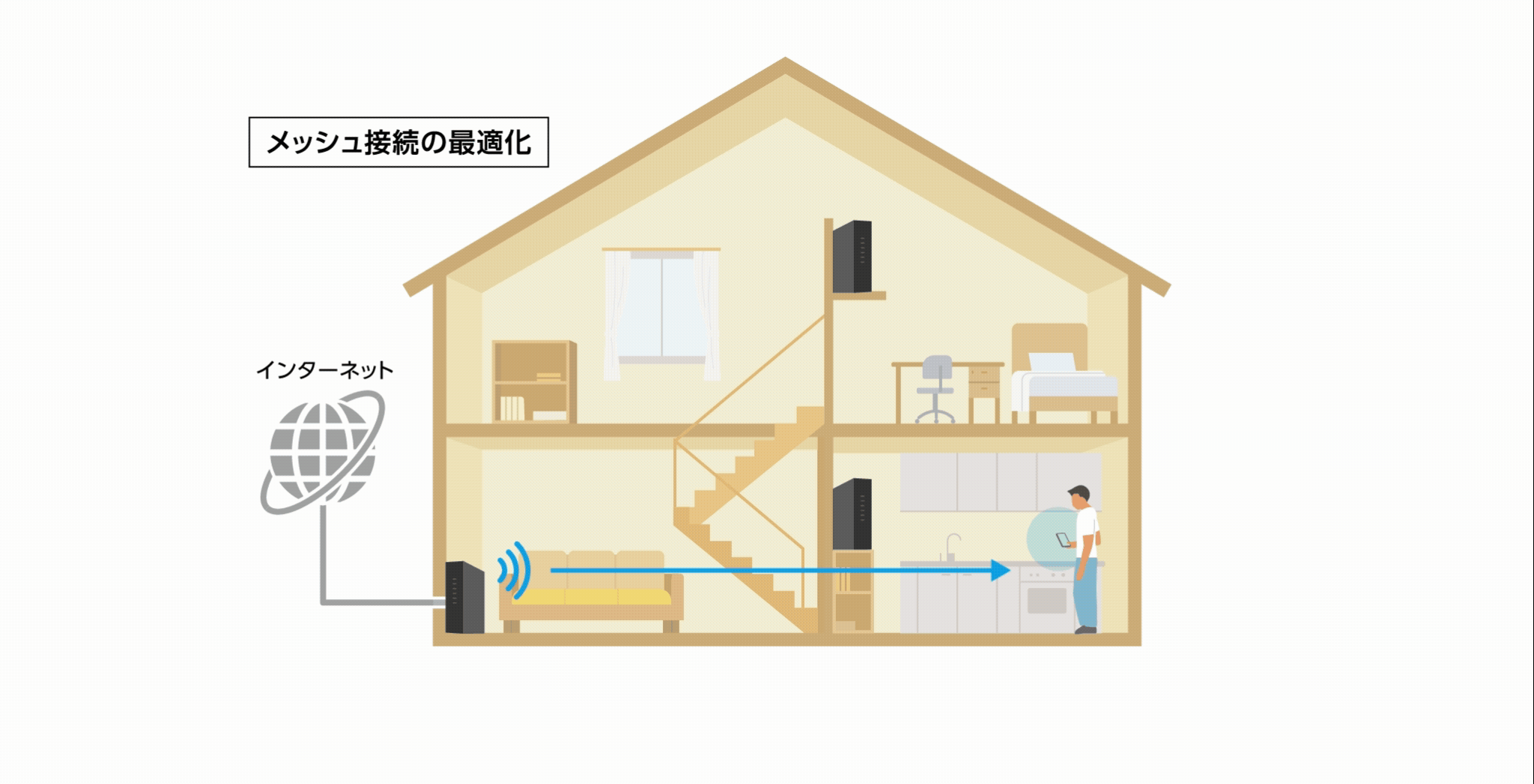 周囲のWi-Fi機器情報を端末へ共有し、再接続を効率化することで高速ローミングを実現します。(IEEE 802.11k/11v/11r対応)。 端末が移動してもスムーズに切り替わり、家じゅうで快適にご利用いただけます。