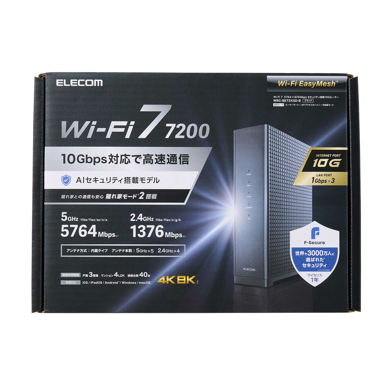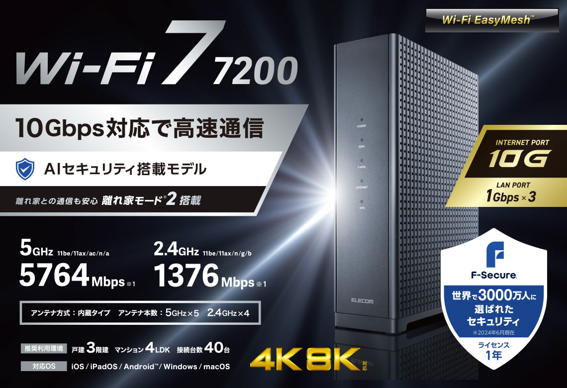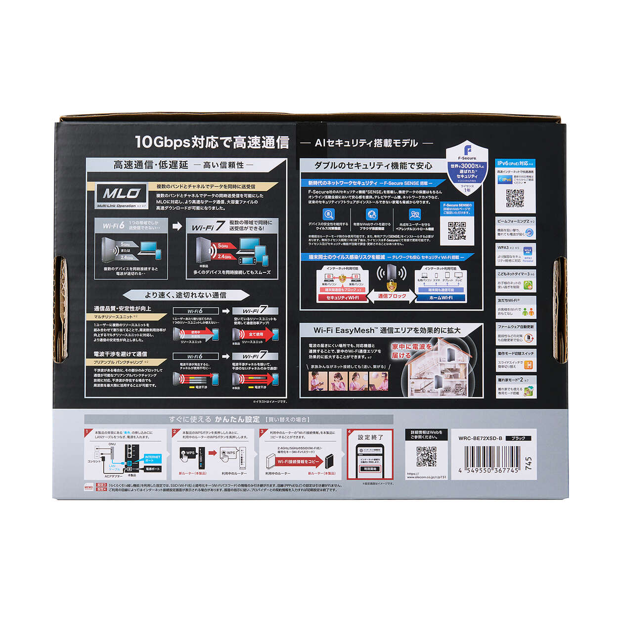 Wi-Fi 7対応でさらに高速な通信を手軽に実現。INTERNETポートは10Gbps対応で、普及が進む10G回線のメリットを最大限に活かします。通信エリアを広げるWi-Fi EasyMesh(TM)、家中まるごと安心のAIセキュリティ機能、F-Secure SENSE搭載。これからの高速通信サービスにも対応する、IPv6(IPoE)対応 Wi-Fi 10ギガビットルーターです。