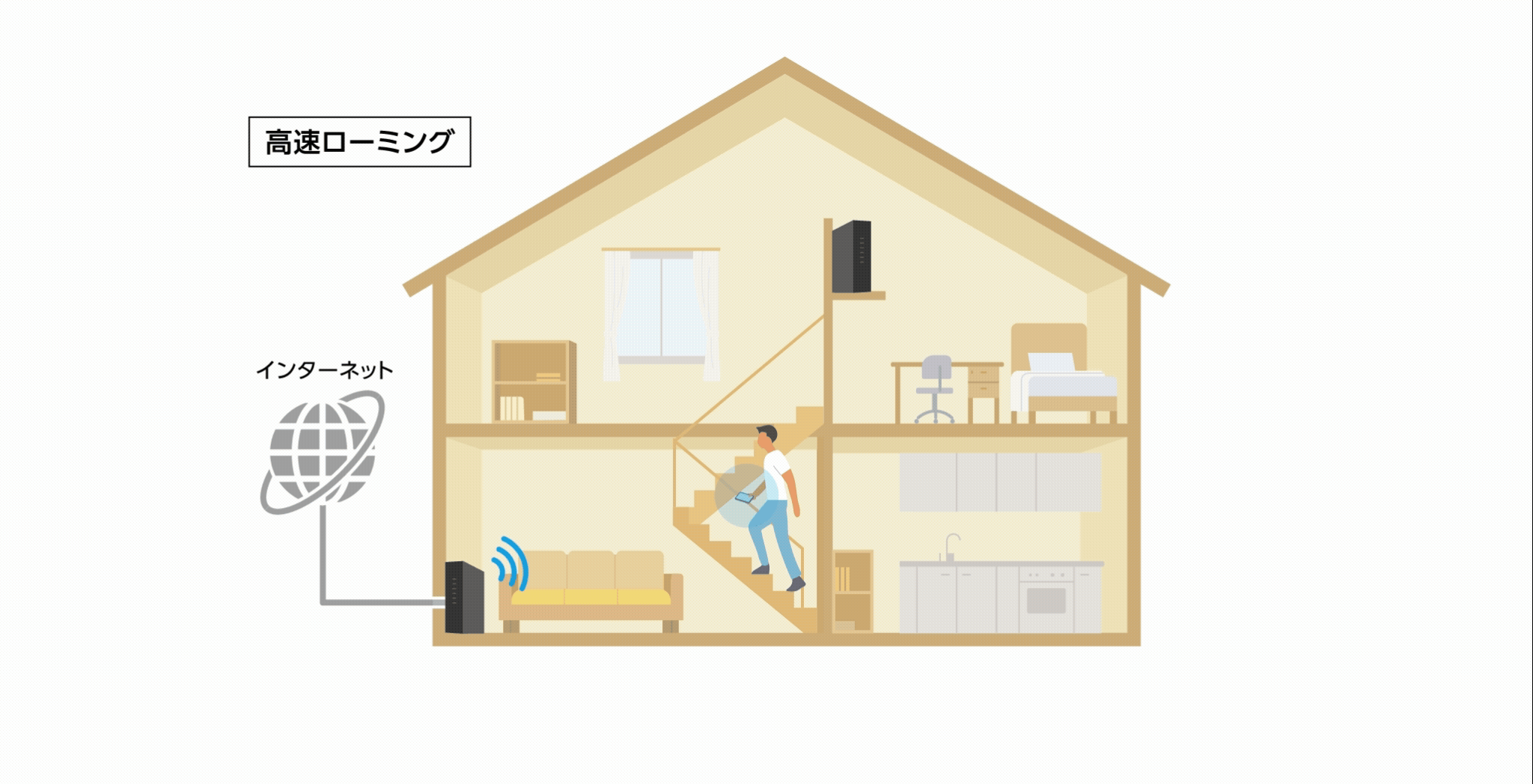 電波の届きにくい場所でも、対応機器と連携することで、家中のWi-Fi通信エリアを効果的に拡大することができます。 高速なローミングのため、お部屋を移動して接続先が切り替わっても、再接続がスムーズなため快適な通信を維持することができます。