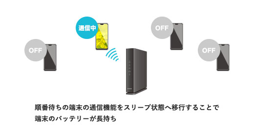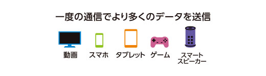 複数台接続に強いOFDMA、送信情報量をアップする1024QAM、複数台同時接続が可能なMU-MIMO(※)、スマホのバッテリーが長持ちするTWTなど、多くのデバイスをつないでもストレスなくスムーズな通信を実現します。