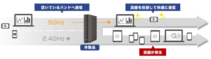 「バンドステアリング機能」を搭載し、より快適な帯域(5GHz/2.4GHz帯)を自動で選択・接続します。