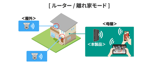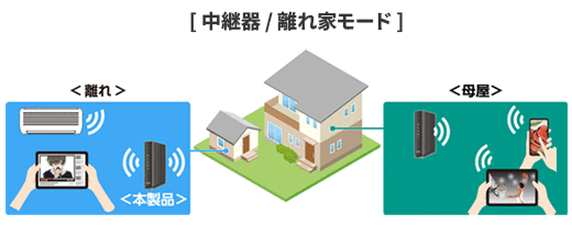 屋外を含む敷地内の母屋と離れた建物で中継器として使用可能なほか、「離れ家モード2」対応製品ではすべての基本動作モードに対応。