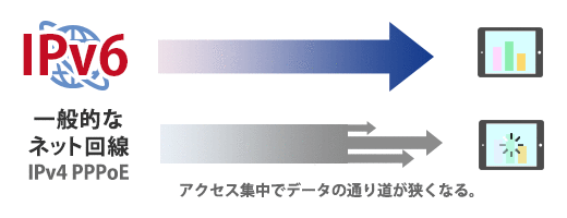 回線が混雑しにくいIPv6(IPoE)インターネット接続に対応し、スムーズな通信が可能です。 IPv6(IPoE)インターネット接続であれば、本製品のINTERNETポートにLANケーブルを接続するだけですぐにインタ―ネットが使えます。