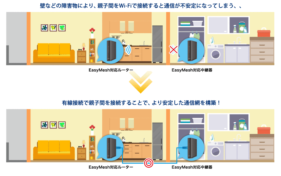 EasyMesh対応ルーター(親機)とEasyMesh対応中継器(子機)の間をWi-Fiで接続しようと思ったら、障害物(各部屋の壁など)が多く通信が不安定になってしまう、、、そんな方は親機、子機間を有線で接続する方法がオススメです。