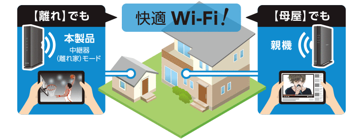 母屋と離れのWi-Fi通信を快適にする「離れ家モード2」を搭載。屋外を含む敷地内の接続エリアをカバーし、離れた部屋でも安定した通信が可能になりました。