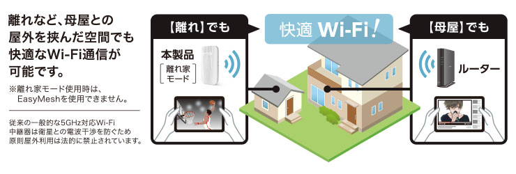 法的に屋外利用が認められた帯域のみを利用し、ルーターと中継器の間の電波を中継する機能です。