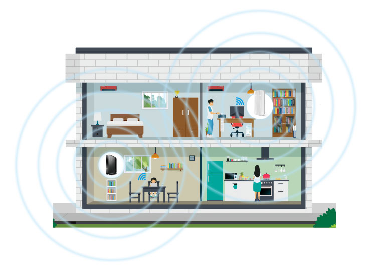 電波の届きにくい場所でも、対応機器と連携することで、家中のWi-Fi通信エリアを効果的に拡大します。