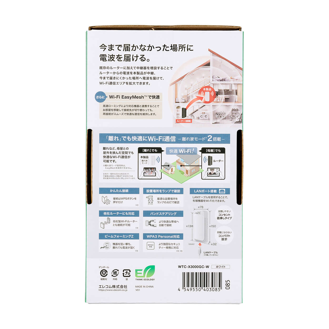 「電波が届かない」を解決するWi-Fi 6対応中継器。高速かつ家中どこでも安定した通信を実現する、AX3000モデル。「離れ家モード2」を搭載し、母屋と離れ家などの建物間でも接続が可能です。壁面コンセントに直接挿し込めるスリムな設計で、省スペースですっきりと設置できます。