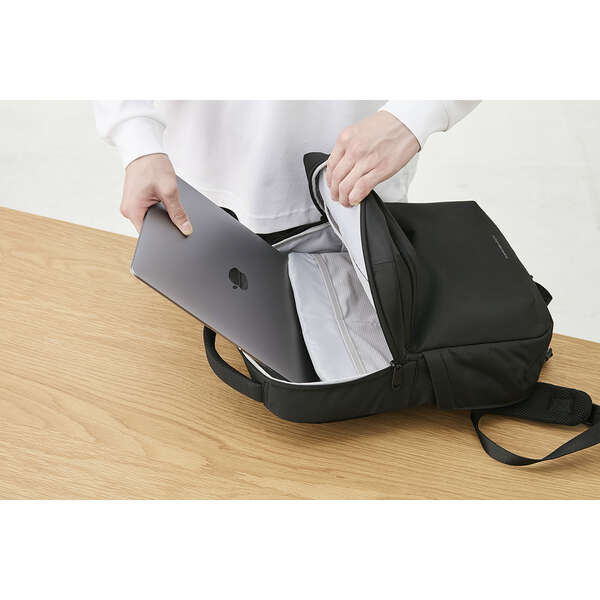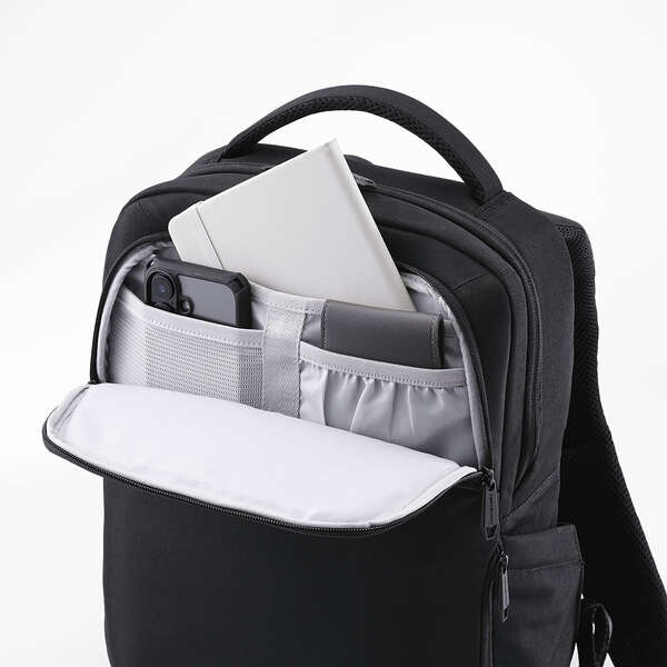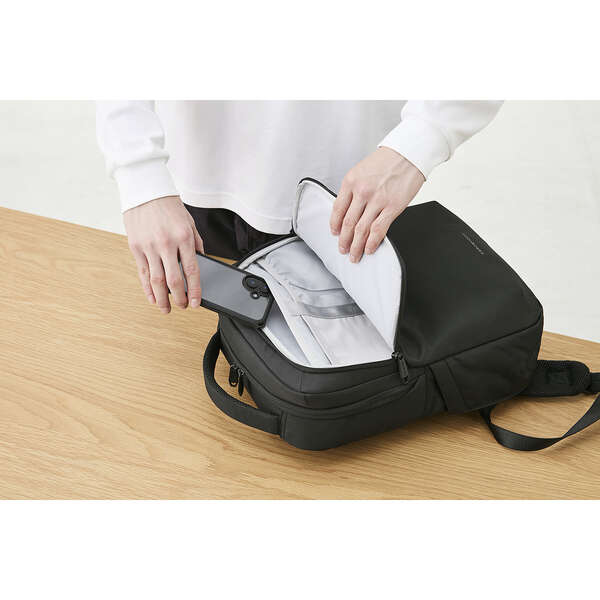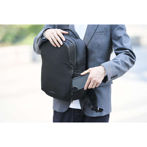 低反発ウェーブカットウレタンフォームがしっかりと衝撃を吸収!大切なノートパソコンを衝撃から守る"ZEROSHOCK"バックパックです。パスケースなど、よく使う小物の収納に便利なクイックアクセスポケット付き。移動中でもサッと取り出せます。