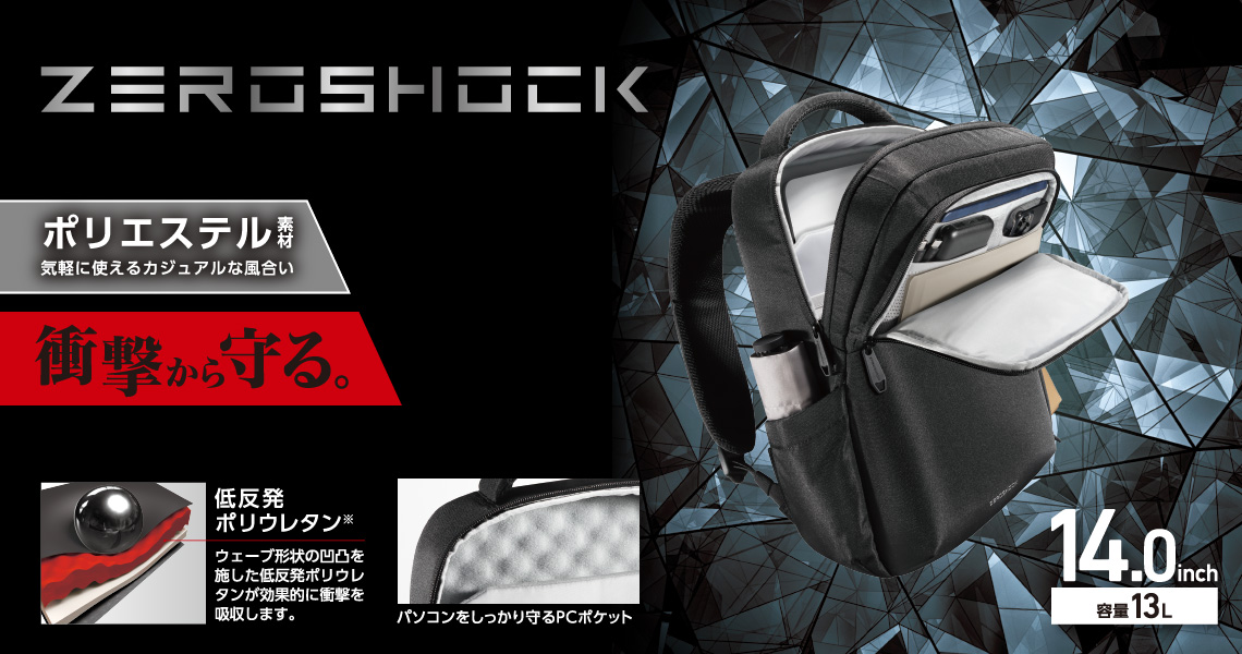 大切なノートパソコンを衝撃から守る"ZEROSHOCK"バックパックです。