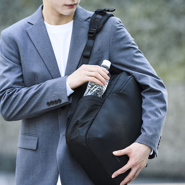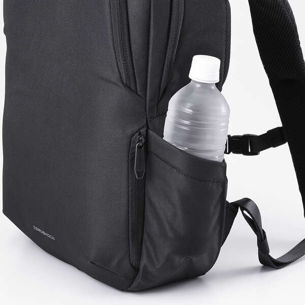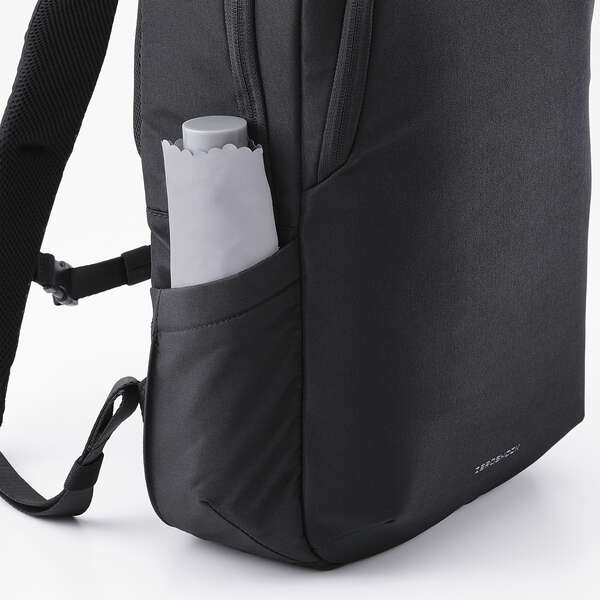 折りたたみ傘やペットボトルを収納できるサイドポケット付き。背負ったままでもスムーズに出し入れできます。