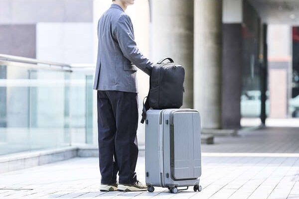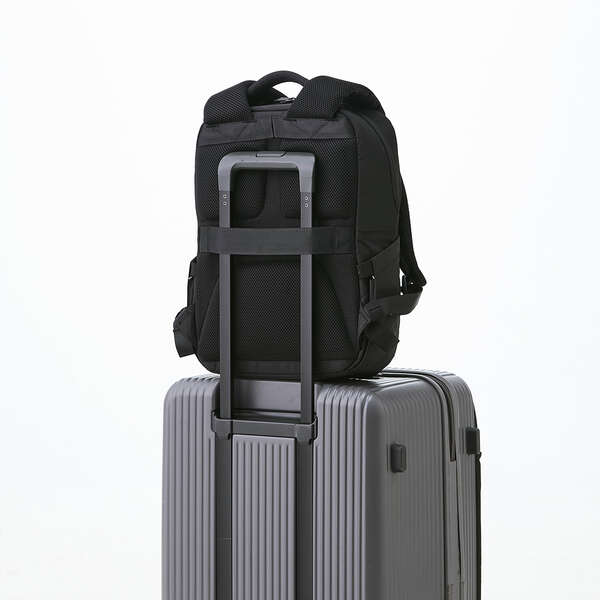 背面にキャリーバーへ固定できるキャリーベルトを配置しています。キャリーケースと一緒に持ち運べるので移動がスムーズになります。