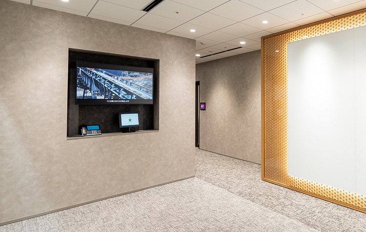 執務室の交流エリアでは、大型モニターが情報発信&共有に活躍