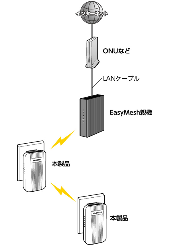 EasyMesh親機と本製品を以下のように無線接続またはLANケーブルで接続します。