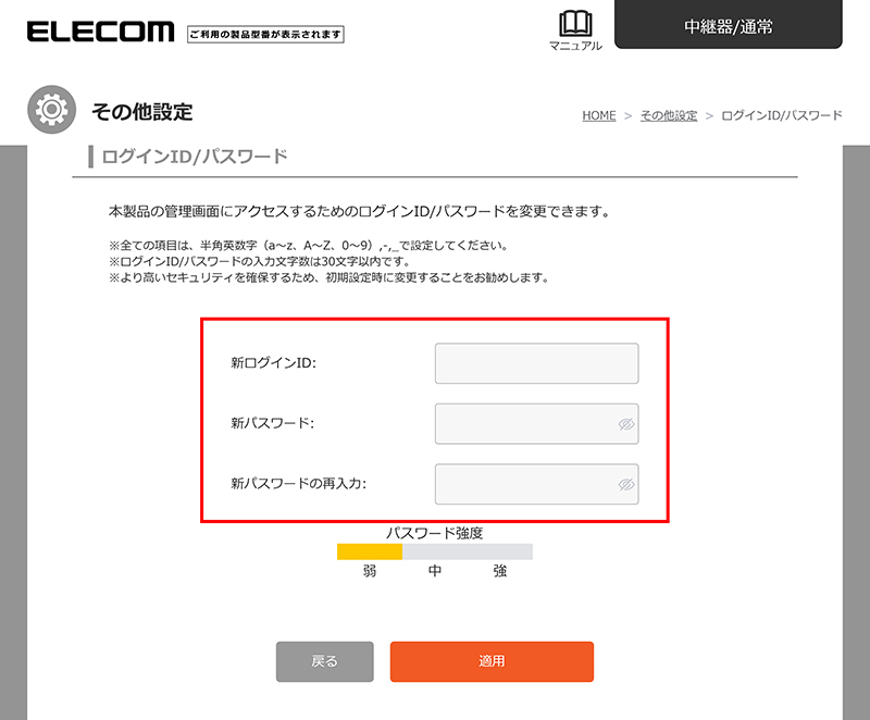 この画面で、新ログインIDと新ログインパスワードを入力し、「適用」を選択します。