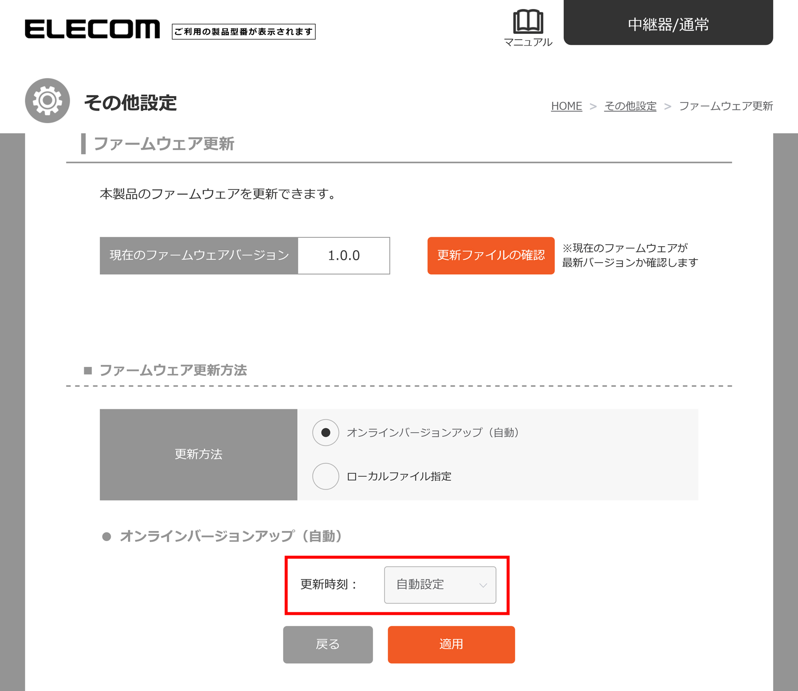 エレコム・ファームウェアサーバーに最新のファイルがある場合は、一日に一度指定した時間に自動的にアップデートします。