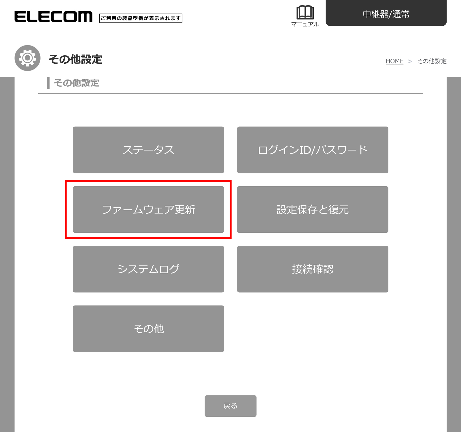 「その他設定」画面が表示されますので、「ファームウェア更新」を選択します。