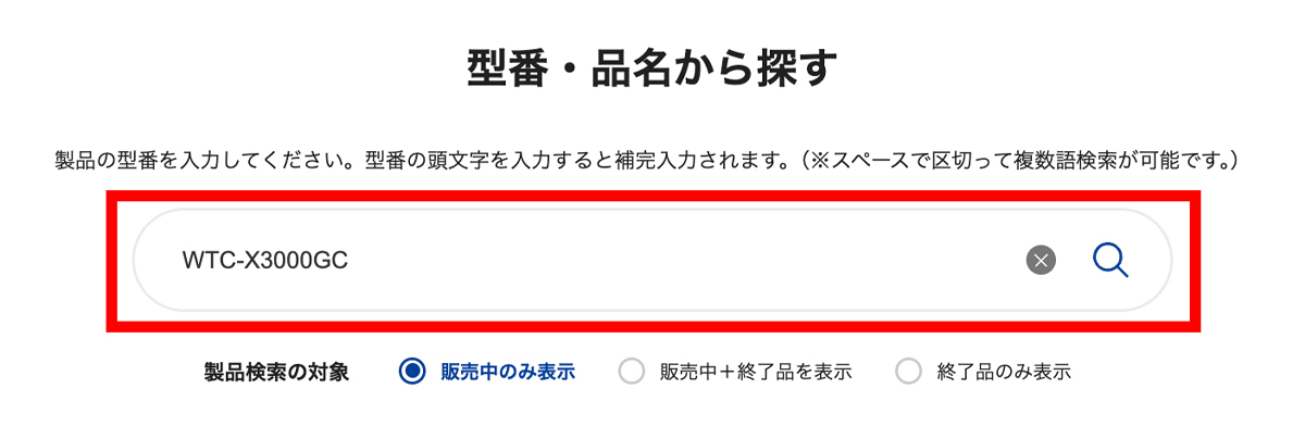 「型番から探す」で型番(WTC-X3000GC、またはWTC-X1500GC)を入力し、検索します。
