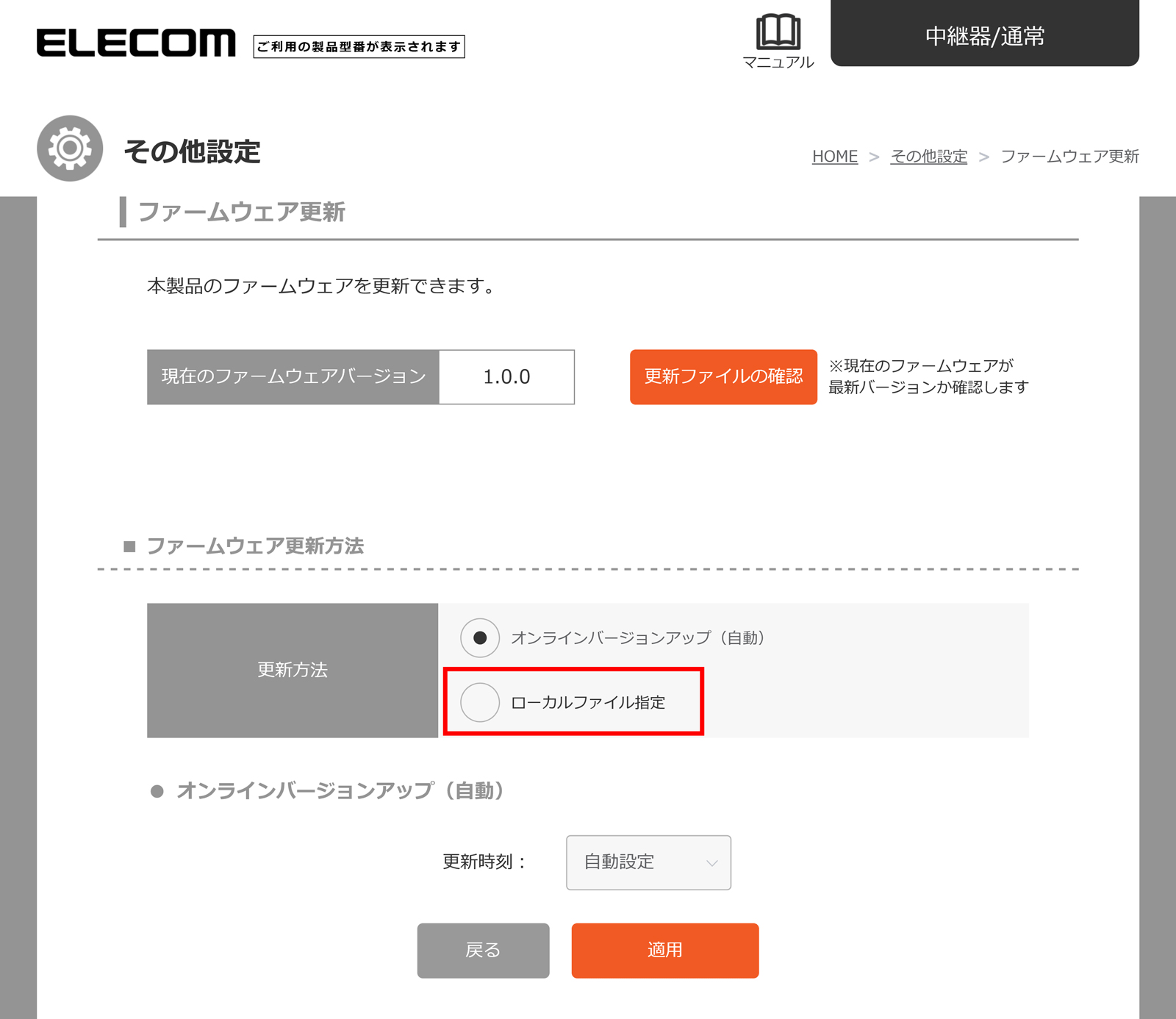 | ローカルファイル指定 | ダウンロードしたファームウェアファイルを指定してアップデートをおこないます。 ダウンロードしたファイルを指定して更新したい |