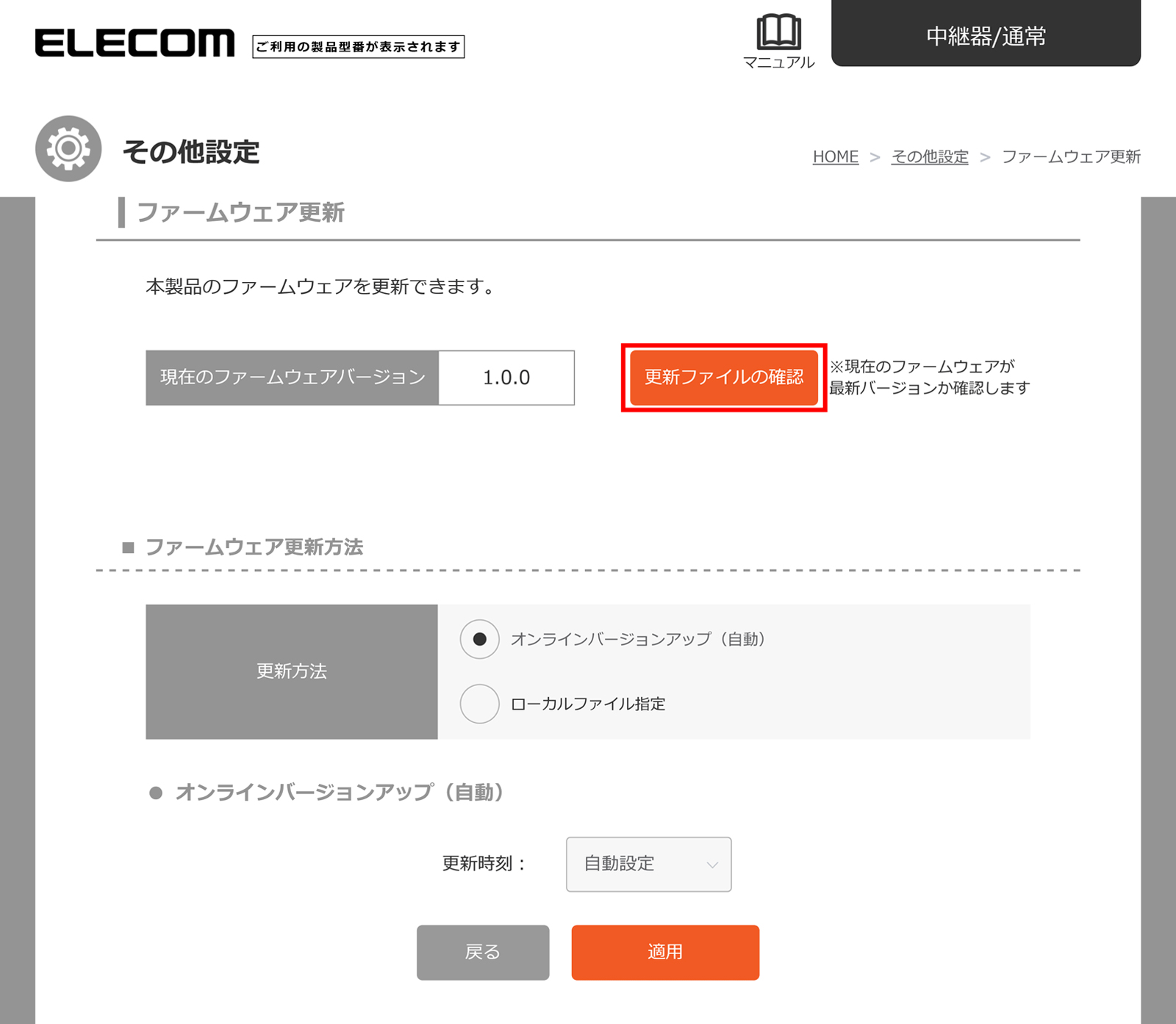 | 手動でバージョンアップする | 「更新ファイルの確認」ボタンを押すと、最新のファームウェアがあるかサーバーに確認し、最新のファームウェアがある場合は、更新することができます。 サーバー上のファイルを使って更新したい |