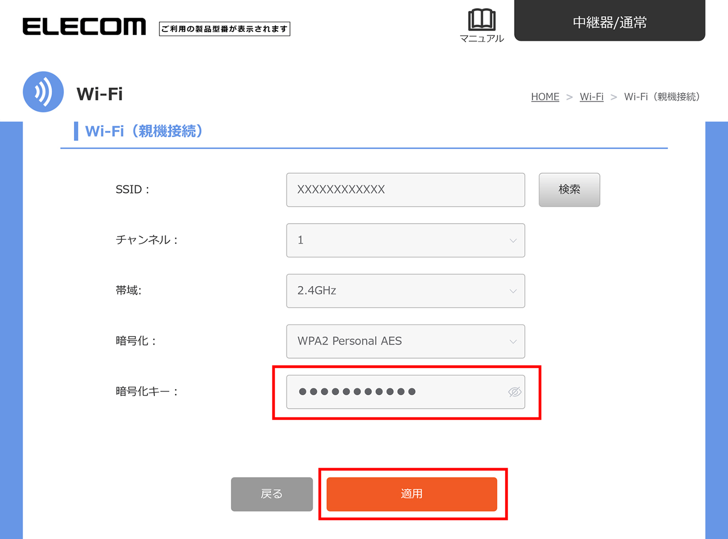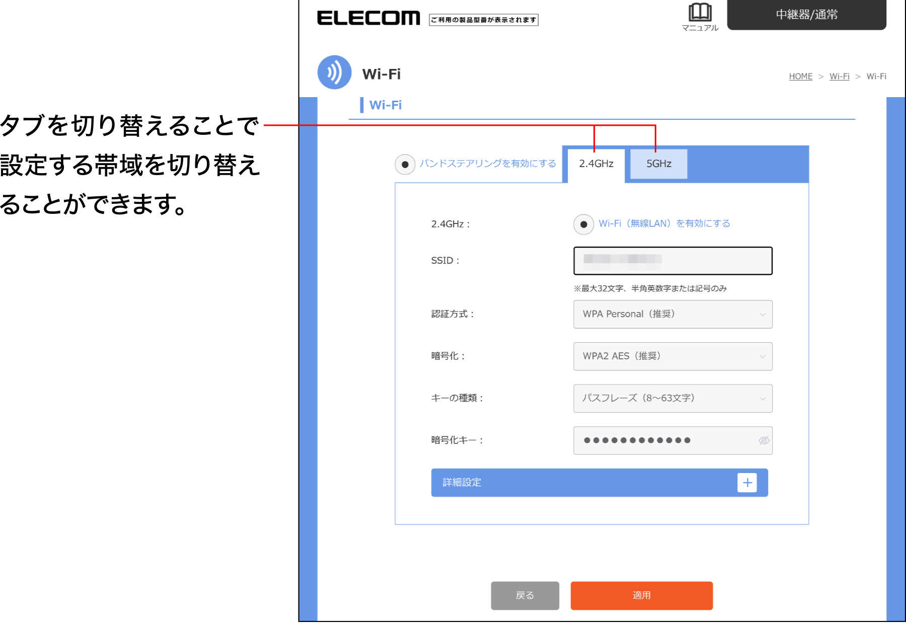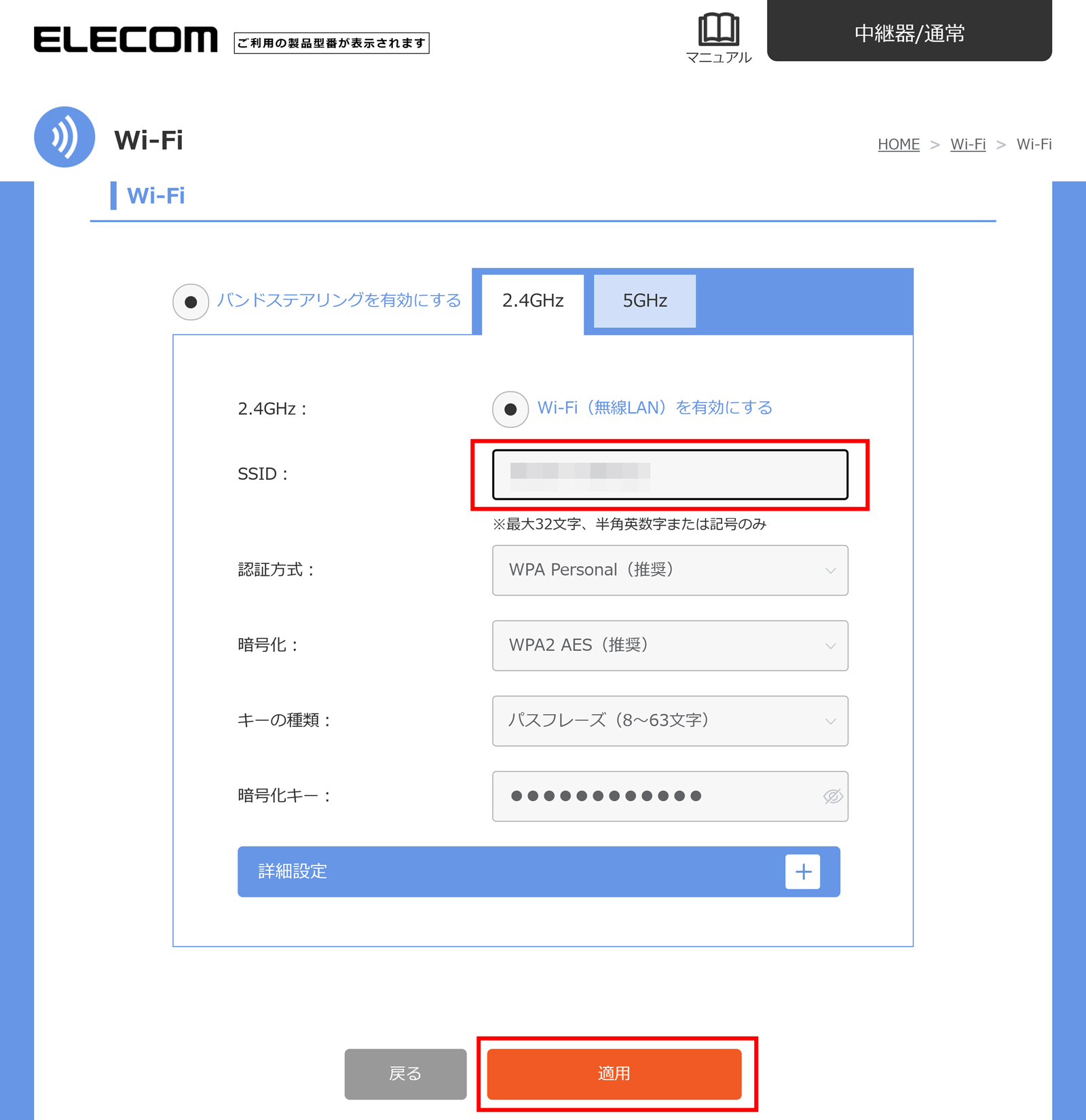 5GHzまたは2.4GHz の「SSID」を設定し、「適用」を選択します。