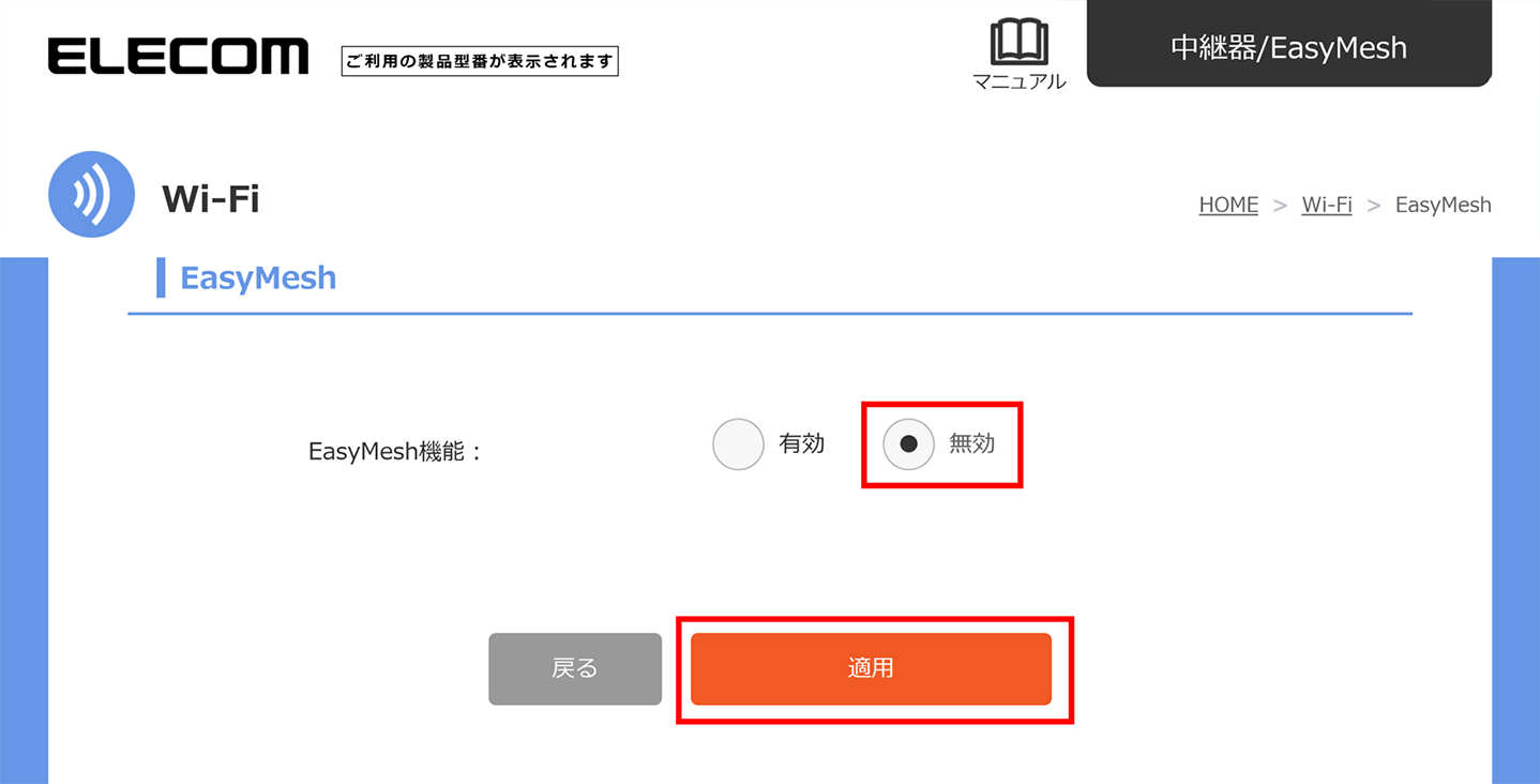 ②「EasyMesh 機能」の「無効」にチェックを入れ、適用ボタンを押します。