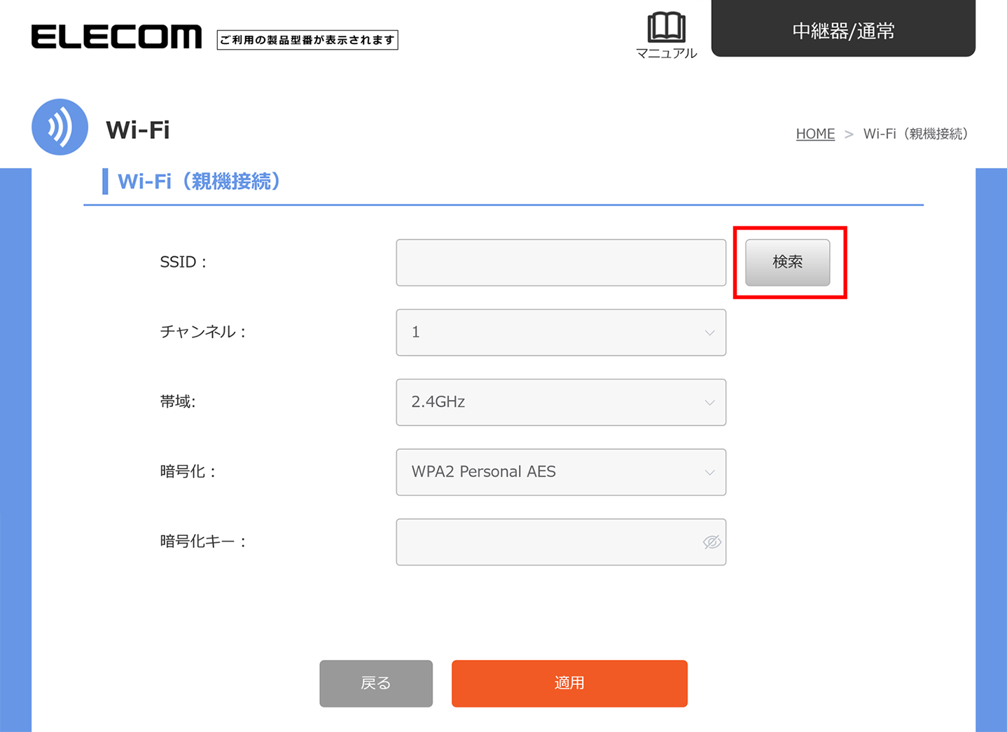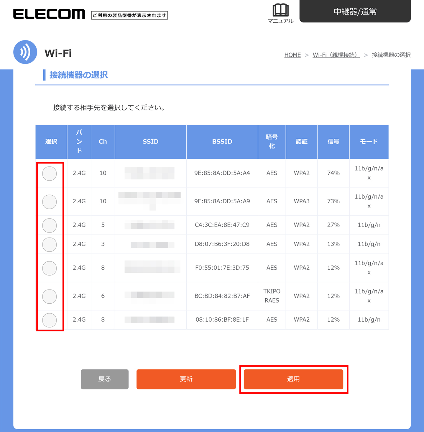 ③本製品が接続可能な機器の一覧が表示されますので、親機のSSID を選択し、「適用」をクリックします。