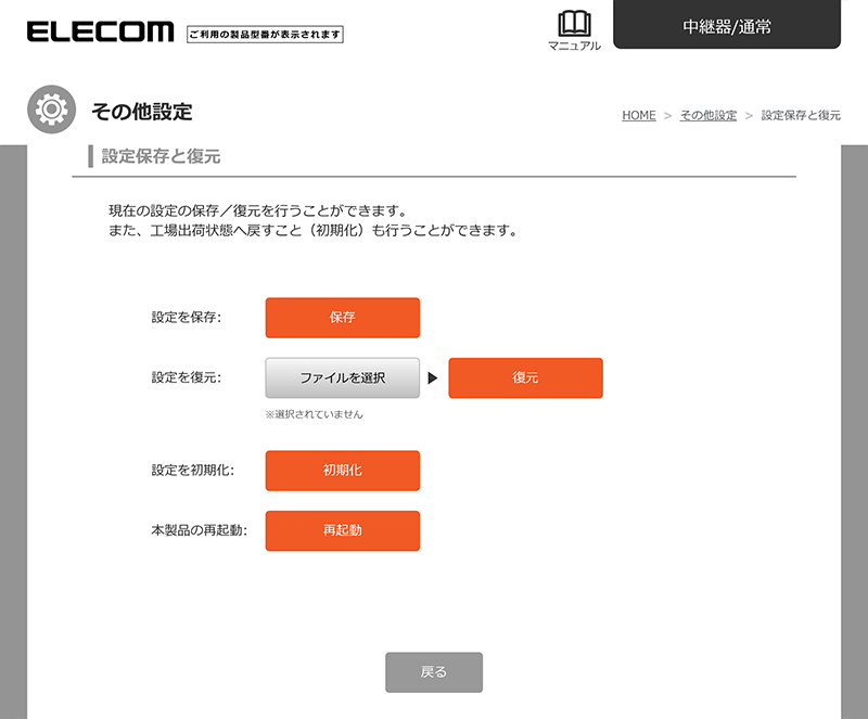 項目 内容 設定を保存 「保存」をクリックすると、「(機種名)_setting.bin」というファイル名で保存されます。 設定を復元 「設定を保存」で保存したファイルを選択し、「復元」を選択すると、保存した設定が復元されます。 - 設定が反映されるまでにしばらく時間がかかります。本製品の電源を切らないでください。