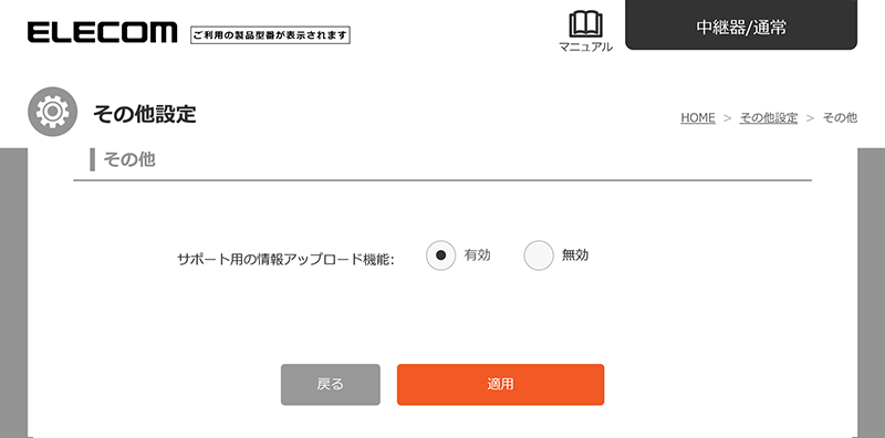| その他 | サポート用に使用する情報のアップロード機能の有効/無効を設定します。詳細 |