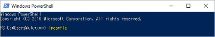 「Windows Powershell」画面が表示されますので、「>」のあとにカーソルが点滅している状態で、キーボードから「ipconfig」と入力し、[Enter]キーを押します。