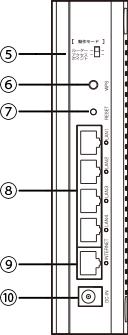 | ⑤動作モード切替スイッチ | 本製品の動作モードを選択するスイッチです。 ルーターモード / アクセスポイントモード から選択できます。初期値は「ルーターモード」です。 動作モードを切り替えるときは、必ず本製品の電源を切った状態でスイッチを変更してください。 |
