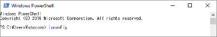 「Windows Powershell」画面が表示されますので、「>」のあとにカーソルが点滅している状態で、キーボードから「ipconfig」と入力し、[Enter]キーを押します。