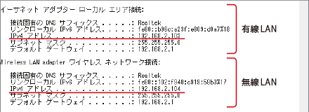 有線LAN接続は「イーサネットアダプターローカルエリア接続」、無線LAN接続は「Wireless LAN adapterワイヤレスネットワーク接続」の「IPv4アドレス」に現在のIPアドレス「192.168.xxx.xxx」が表示されます(xxxは任意の数字)。