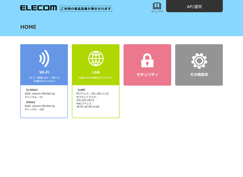AP(アクセスポイント)モード時の本製品のIPアドレスは、「192.168.2.1」です。