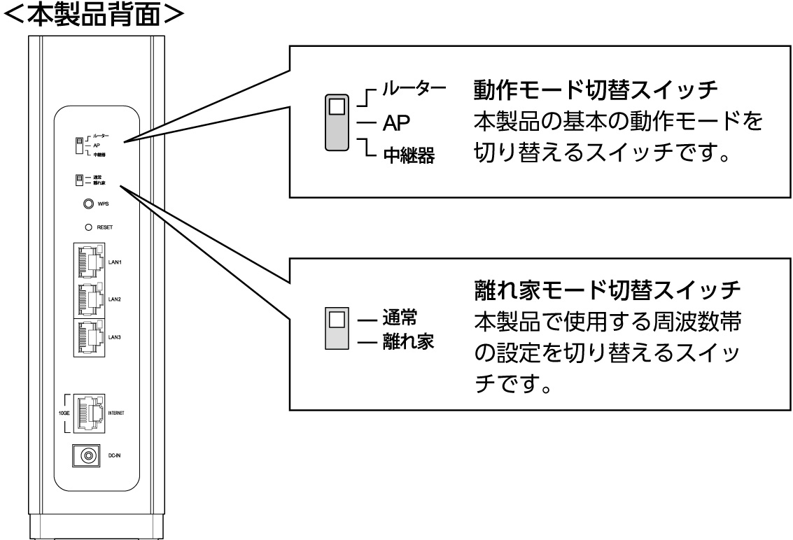 本製品背面の「動作モード切替スイッチ」と「離れ家モード切替スイッチ」を、用途に合わせて切り替えてください。