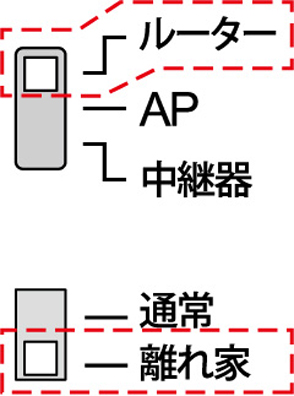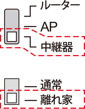 本製品を親機として使用し、かつ玄関先やベランダなど敷地内の屋外に設置されたデバイスも接続する場合はこちらでご使用ください。 初期設定後、スライドスイッチを「離れ家」に変更してください。 ※スライドスイッチを変更した後は、必ず本製品の電源を入り切りして再起動してください。 |