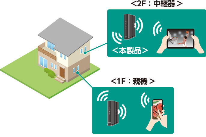 同一の建物内(一戸建ての1Fと2Fなど)で、本製品を中継器として使用する場合はこちらでご使用ください。 詳細 |
