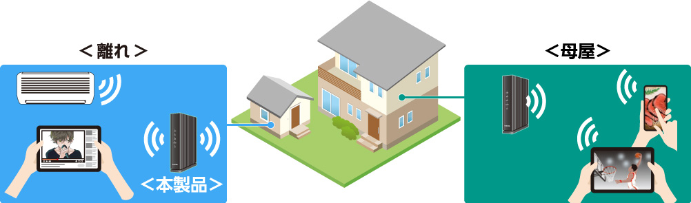 当社の「離れ家モード2」搭載製品を2台使用し、親機と中継器で使用する場合は、屋外/屋内の使用にかかわらず、「親機:ルーター(またはAP)/離れ家モード」~「中継器:中継器/離れ家モード」の組み合わせでご使用いただくと、親機と中継器間の接続がさらにスムーズになり、離れた部屋でもより安定した通信が可能になります。