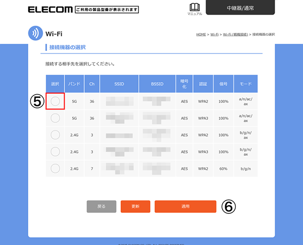 ⑤お使いのルーターのSSID(Wi-Fi名)が表示されたら、「選択」をクリックします。