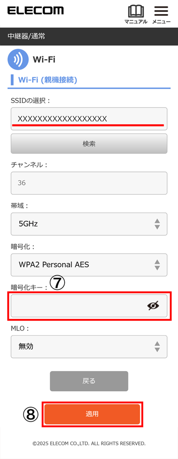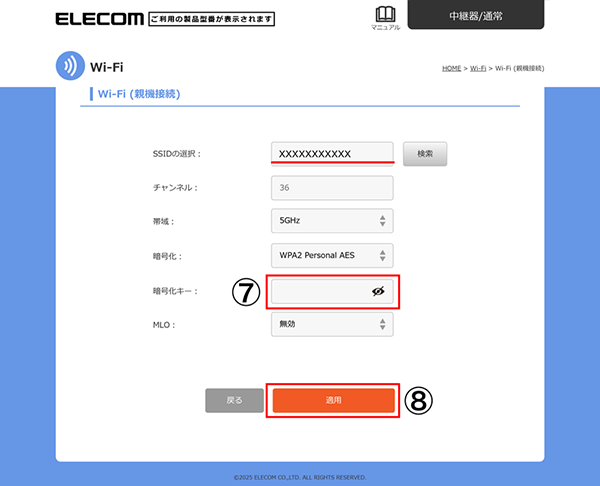 「帯域」の表示を接続したい帯域に変更して、SSIDの欄に入力(Wi-Fi名)を入力後⑦にお進みください。 -