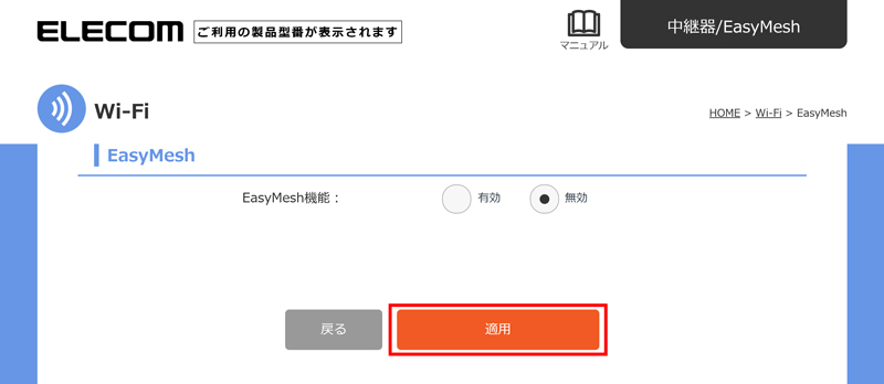 ③「 EasyMesh 機能」を「無効」に設定し、「適用」をタップします。