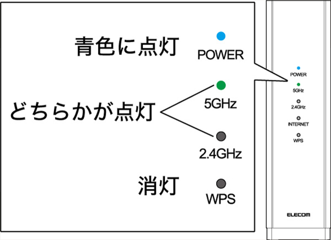 本製品のPOWERランプが青色に点灯し、2.4GHzまたは5GHzランプのどちらかが点灯します。