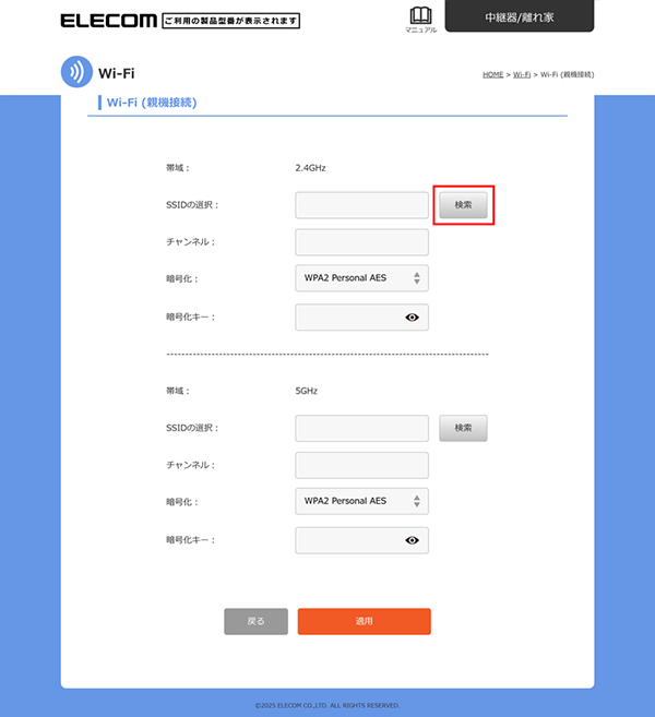 2.4GHzのSSID選択後、暗号化キーを入力し、5GHzのSSIDを検出し選択した場合、入力した暗号化キーが空欄に戻ってしまします。両方のSSID選択後に両方の暗号化キーをご入力ください。
