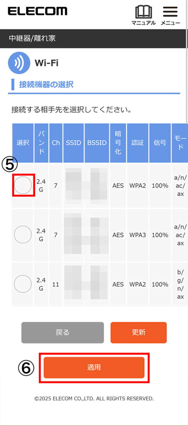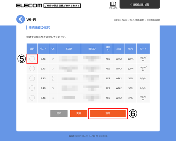 ※Wi-Fi接続情報=SSID(Wi-Fi名)、暗号化キー(Wi-Fiパスワード)⑤お使いのルーターのSSID(Wi-Fi名)が表示されたら、選択をクリックします。