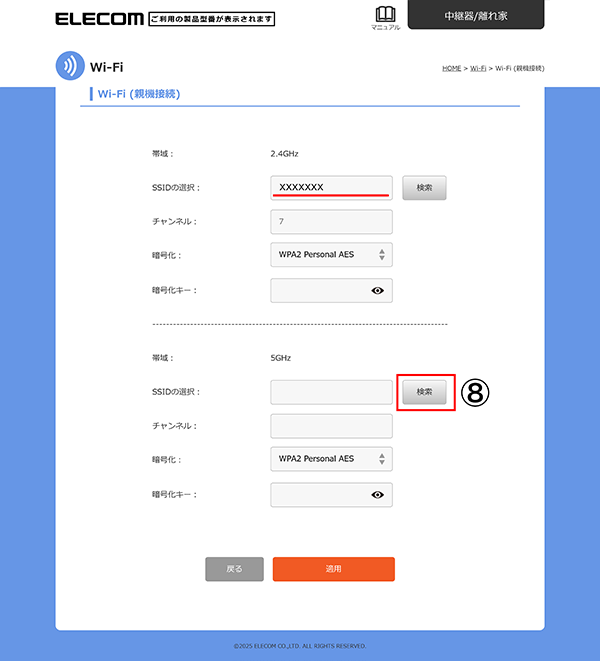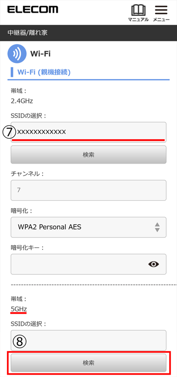 ただし、弊社としては5GHzおよび2.4GHzの両帯域を設定されることを推奨しています。⑧スクロールし、2.4GHzのSSIDの「検索」をタップします。