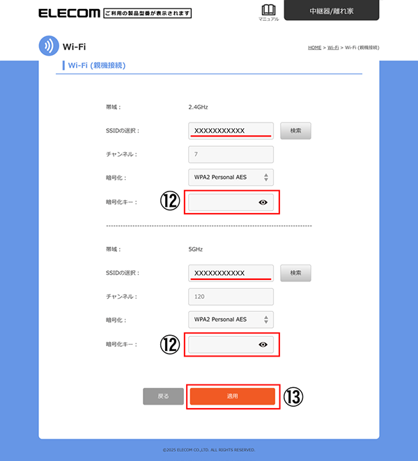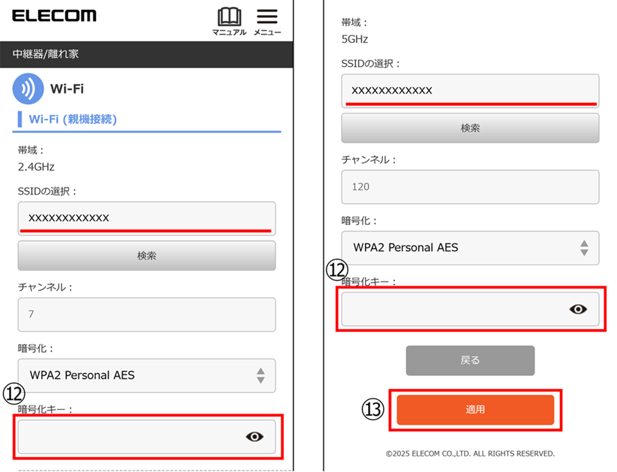 ※SSID(Wi-Fi名)を両方入力した場合は、下図両方に暗号化キー(Wi-Fiパスワード)を入力します。