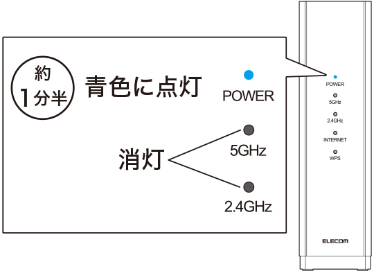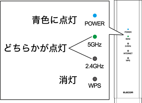 本製品のPOWERランプが青色に点灯し、2.4GHzまたは5GHzランプのどちらかが点灯します。